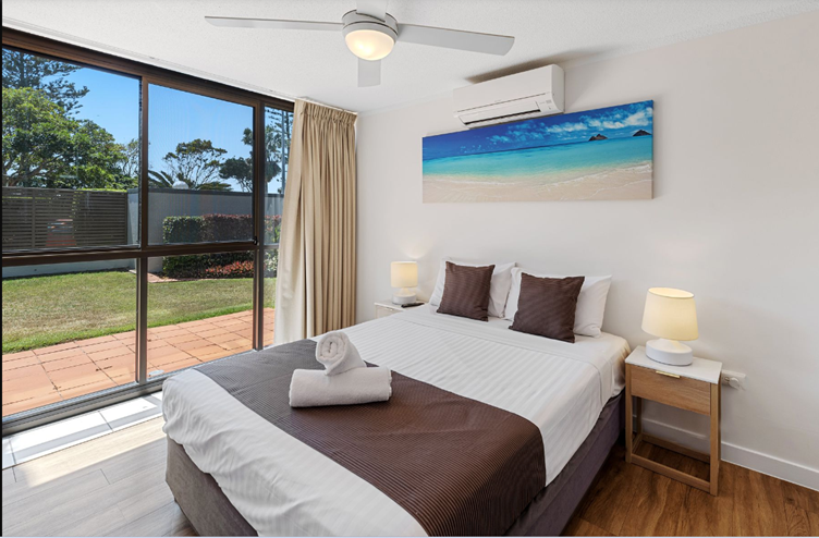 This apartment is a great budget alternative, the living and kitchen opens out onto a lovely sunny courtyard with a lawn area. Upstairs are 2 bedrooms, 1 bathroom and full laundry facilities. There is air conditioning in the living area and fans in both bedrooms. It provides “lift free” access to the outdoor BBQ area and swimming pool and can be locked down to a 1 or 2 bedrooms.