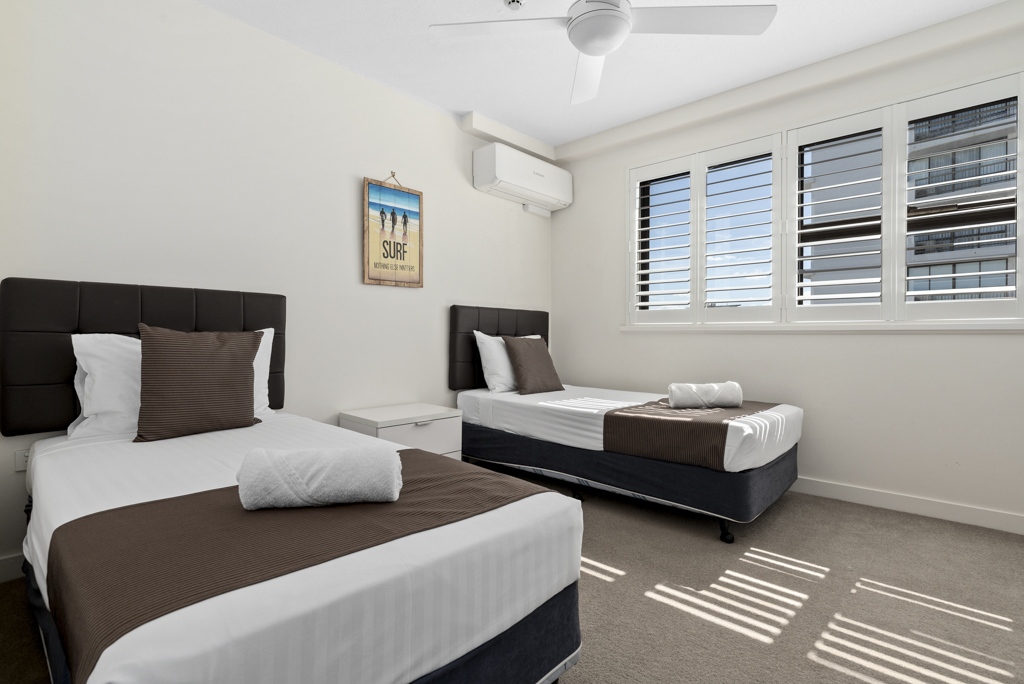 A full panoramic ocean view balcony provides wonderful views of the ocean with the southern apartments also overlooking Mooloolaba. This spacious and fully self contained, air conditioned apartment is located on our higher level, with everything that you need to enjoy your family holiday.